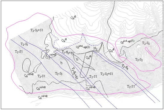 - The tertiary period Pliocene series (N2) is distributed on the top of the landslide slope, soft, and mainly composed of red-purple aleuropelitic rock. Unconformable contact exists between the stratum and the T2c layer.