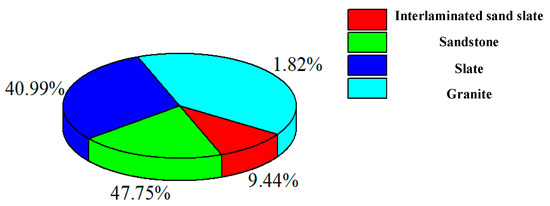 Results of the geological survey using adits (Figure 8) on the landslide slope are presented in Table 1. It can be seen from the table that the amount of sandstone and slate are similar, and the ratios are 47.75% and 40.99%, respectively. The ratio of interlaminated sand slate rock is 9.44%, and that of granite is 1.82%, as shown in Figure 9.