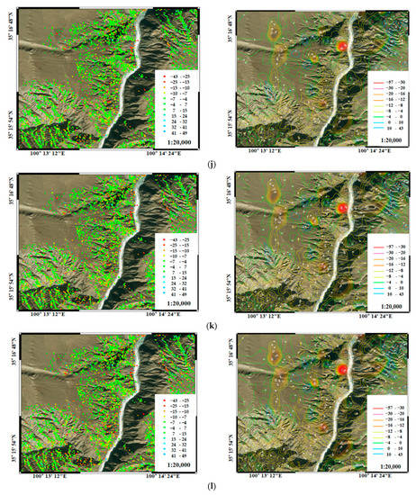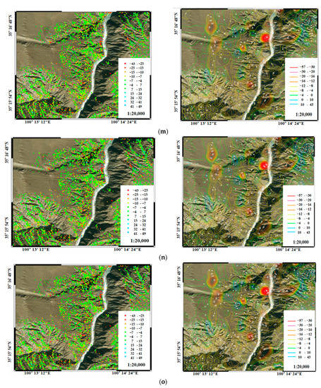 Cumulative deformation distribution map of the slope. (a) As of January 2015; (b) As of May 2015; (c) As of August 2015; (d) As of December 2015; (e) As of March 2016; (f) As of August 2016; (g) As of November 2016; (h) As of April 2017; (i) As of August 2017; (j) As of February 2018; (k) As of June 2018; (l) As of October 2018; (m) As of February 2019; (n) As of May 2019; (o) As of August 2019.