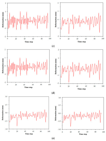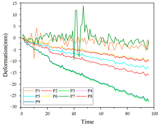 Figure 13 shows that certain points have the same deformation pattern. For example, Points 1 and 7; Points 2, 4, and 6; and Points 3 and 9 have a similar deformation trend. Hence, we selected the deformation data of Points 1, 2, 5, 8, and 9 to conduct the study.
