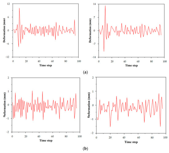 The ARIMA model was applied to first predict slope deformation. For the dataset, the monitored slope deformation data from November 2014 to November 2018 and from November 2018 to August 2019 were used as the training and testing data, respectively. Each time step represents an observation of the slope. RMSE, MAE, and R2 were used to evaluate the model. The first and second order differences were used to analyze the data sequence. The first order difference and second order difference were adopted to analyze the data sequence. The result of the first order difference and second order difference for the data sequence are shown in Figure 14.