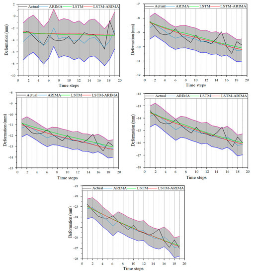 Figure 15 illustrates the actual data sequence and predicted results of ARIMA, LSTM, and LSTM-ARIMA. The upper and lower boundaries of the 95% confidence interval are also illustrated, and the gray area between the upper and lower boundaries of the 95% confidence interval. The time steps refer to the time at which the slope deformation was monitored using InSAR. All the prediction points are in the gray zones, which can be used to predict the trend and bias using ARIMA. However, a contrary trend can also be predicted by ARIMA, causing a significant error. Thus, the mean trend was predicted using LSTM and LSTM-ARIMA. For Point 1, the trend was nearly 0, and the prediction performance was poor. The data trends of the five points were similar, and the models had a similar performance, indicating that the proposed model is robust.