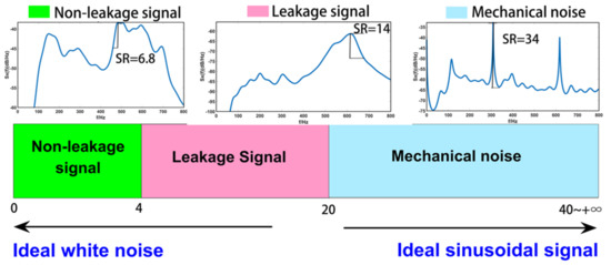 Meng et al. proposed that some statistical parameters of the time and frequency domains were meaningful for leak detection [3]. Mahmutoglu and Turk also studied the characteristics of acoustic emission signals generated by the leakage of underwater natural gas pipelines and reported that there were continuous signal characteristics with narrow bandwidths [4]. The test data had a bandwidth of 5 Hz at the peak energy attenuation of 15 dB. Dhar et al. reported that the frequency range of on-site WDS leakage was between 500 and 1400 Hz [1]. In another work, Lu and Wen pointed out that the leakage signals of WDSs followed a Gaussian distribution [5], and the signals were mainly propagated in the pipe and caused the pipe wall to vibrate. These findings regard the evaluation of leakage in actual operation that is easy to characterize. However, the complex environment in actual operation may cause great difficulties to leak detection. Zhang and Guo pointed out that leakage was the most critical factor affecting the energy of the leakage signal, and the autocorrelation peak of the signal was significantly more noticeable than that of the ambient noise [6]. Ni et al. also found a method to extract feature vectors based on the entropy [7]. In high noise, this method could extract the features of signals better than methods based on general physical parameters.