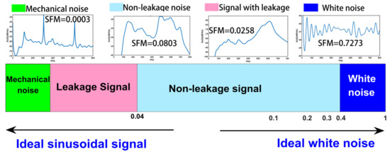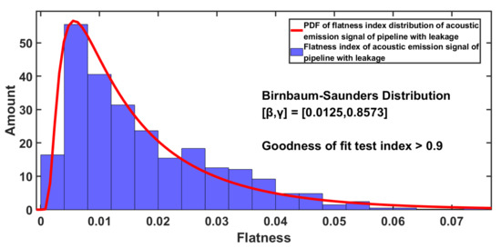 Analyzing the data demonstrated that the spectral flatness distribution of the leakage signals conformed to the Birnbaum–Saunders distribution [25], as shown in Figure 12. The distribution equation is expressed as: