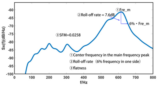 Figure 4 briefly presents the application of the central frequency peak, the spectral roll-off rate, and the spectral flatness in a specific example.