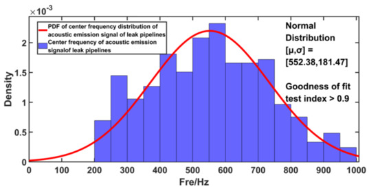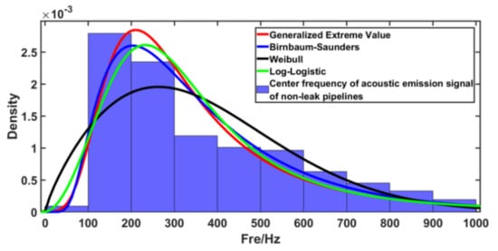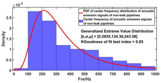 In contrast, the central frequencies of the acoustic signals of the WDS without a leakage follow a generalized extreme value distribution [23], different from that of pipelines with a leakage, as depicted in Figure 6,