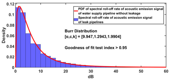 Comparing the standard distributions fitting the spectral roll-off rates of the acoustic emission signals of the pipelines with a leakage we obtained the Burr distribution, as shown in Figure 9.