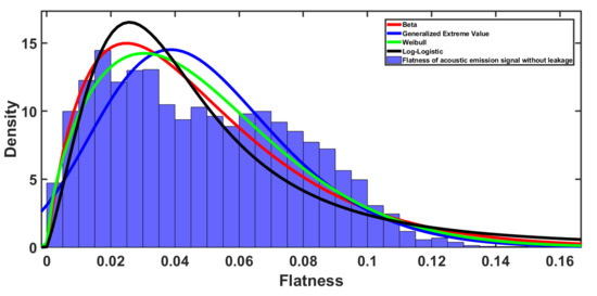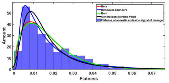 Comparing the standard distributions fitting the spectral flatness of the acoustic emission signals of the pipelines with leakage, we obtained the Birnbaum–Saunders distribution, as depicted in Figure 13.