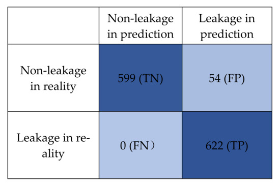 Random forest is used to distinguish signals in the presence or absence of a leakage from the detection signals. It is composed of many decision trees not related to each other. During the model running, each part will obtains classification results separately. The final result of the model is determined by the voting method. In this research, the depth of Random Forest was set to 50, and the number of trees of that was set to 280. The feature of {the central frequency peak, spectral roll-off rate, the spectral flatness} was set as the input data of the Random Forest model. In this task, the numbers of training and validation data were set to 80 and 20. There were 6380 input data, of which 3113 were leakage data, and 3272 were non-leakage data. The confusion matrix of the Random Forest model’s validation is shown in Figure 16.
