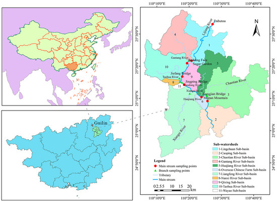 The Lijiang River originates in Mao’er Mountain (altitude 2141.5 m), the main peak of the Yuecheng Mountain in the northwest of Xing’an County, Guilin City. The main stream of the Lijiang River flows through Xing’an, Lingchuan, Guilin, Yangshuo, Pingle, and other cities and counties, with a total length of 214 km [26]. The Lijiang River is a rain source river with an annual average runoff of 4.031 billion m3. The wet season runs from April to August and the dry season runs from December to the end of January of the next year [8]. Guilin has less arable land per capita, and the quality of the arable land needs to be improved. The arable land per capita is 0.085 hm2, which is lower than the 0.096 hm2 in the region and 0.106 hm2 in the country. The extent and effectiveness of the land use and the level of intensive land use in Guilin are not high, and the land is heavily used rather than maintained, with local soil erosion being more severe. The agricultural planting pollution is extensive, complex, and random, rendering statistical analysis somewhat difficult. In the Lijiang River Basin (urban areas), the watershed surface contains 150 enterprises with industrial sewage discharge, of which the sewage from 46 of these enterprises did not enter the sewage treatment plant. For the industrial enterprises that did not utilize the sewage treatment plant, their sewage was mainly discharged directly into the river and lake water bodies, agricultural land, ground seepage evaporation, and so on. The number of households for which the rural domestic sewage enters the rural centralized treatment facilities and the number of households for which the sewage enters a municipal pipe network accounted for 23.8% of the total. The remainder of the rural household sewage was discharged directly into farmland and local water bodies. The study area includes the Guilin urban section of the Lijiang River as well as areas upstream and downstream. The upstream reach includes Rongjiang Town, Xing’an County (Dabutou section). The downstream reach includes Caoping Town, Yangshuo County. The water quality monitoring point is in the Mopan Mountain section. From the water quality monitoring section of Dabutou to the section of Mopan Mountain, the total length is approximately 60 km. The main tributaries include the Gantang River, Taohua River, Xiaodong River, Nanxi River, Xiangsi River, Huajiang River, and Chaotian River [27]. The total study area is 2759.78 km2 and includes 11 sub-basins, as shown in Figure 2.