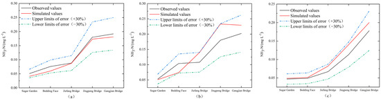 Comparison of measured and simulated values of NH3-N concentration and error range during the (a) wet season, (b) normal season, and (c) dry season.