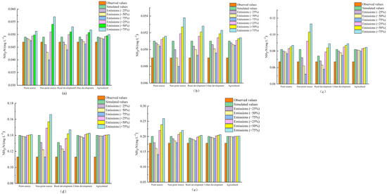 There are three urban sewage treatment plants in the Jingping Bridge–Gangjian Bridge section, resulting in a high proportion of point source pollution and abnormal simulated data. The simulation results presented in Figure 4 show that, with the exception of the Gangjian Bridge section, the water quality fluctuates significantly in response to changes in non-point source pollution emissions. The impact of non-point source pollution on the water quality of the Lijiang River is greater than that of point source pollution. The simulation results show that changes in the discharge of different types of non-point source pollution result in fluctuations in the water quality in all sections in the study area. The degree of impact of different types of non-point source pollution is: Rural development > Urban development without centralized treatment > Agricultural cultivation.