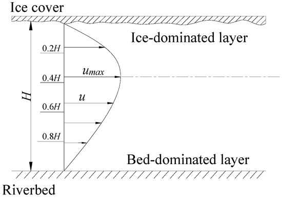 Based on Equation (9), the depth-averaged velocity under ice cover is expressed as: