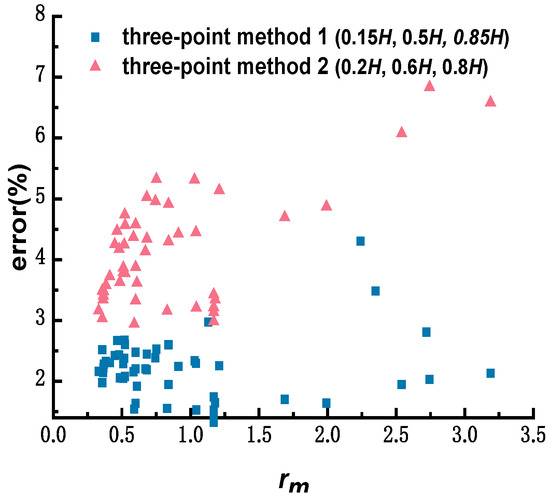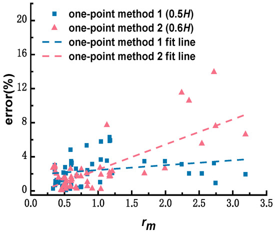 The one-point method at 0.5H and 0.6H were selected, and the commonly used adjustment coefficients of 0.88 and 0.92 [26] were used to compare the errors. The results are shown in Figure 3, where it is observed that the one-point method at 0.5H is relatively stable. The best-fit line representing error margins exhibits a slow upward trend with an increase in rm. Values for rm ranged from 0 to 3.5, and the estimation error of the one-point method at 0.5H was within the range of 6.30%, with an average value of 2.60% and a standard deviation of 1.86. As observed in the figure, the average estimation error of the one-point method at 0.6H is 2.71%, but some values have large deviations; the maximum estimation error is 13.9%, standard deviation is 2.86, and the variation range is large.