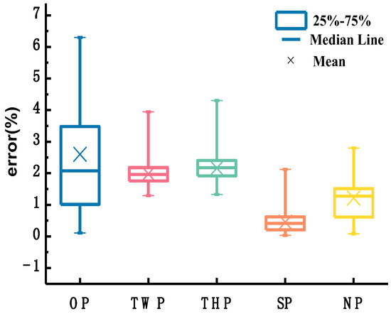 The relative estimation errors of the above methods are obtained from Equation (7) and expressions are summarized in Table 2; the calculated values of the vertical depth-averaged velocity of each flow-velocity characterization method are expressed in Equation (8), and the measured values are expressed in Equation (10). The depth-averaged–velocity-estimation accuracy obtained by each method is compared and analyzed based on sixty groups of basic verification data sets.