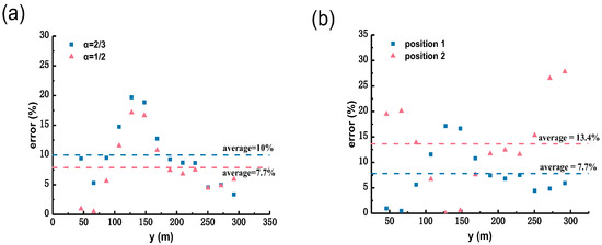 Parameter sensitivity analysis: (a) the effect of the cross-section characteristic coefficient α on the estimation error of unit discharge at each measurement point of the cross-section with a constant survey-point position; (b) the effect of the survey-point position on the estimation error of unit discharge at each measurement point of the cross-section with a cross-section characteristic coefficient α of 0.5.