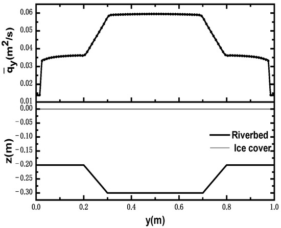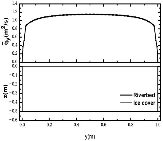 According to Equation (4), the relative-unit discharge distribution under an ice cover is only related to the coefficient α and the distribution of flow depth along the cross-section. The unit discharge at the remaining point i, representing the other points on the ice cover, except for point k along the cross-section direction of the cross-section, can be expressed as: