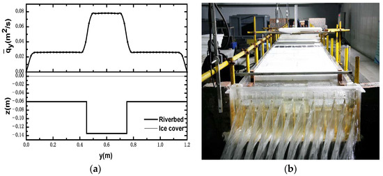 Experimental flume section with main channel and floodplain: (a) section topography showing ice cover, riverbed distribution, and cross-sectional relative-unit discharge; (b) photo of experimental flume.