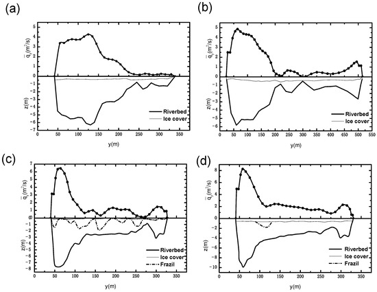 Section topography showing ice cover and riverbed distribution, and cross-sectional relative-unit discharge: (a) Baotou section on 26 January 2014; (b) Dabusutai section on 21 February 2014; (c) Baotou section on 14 December 2014; (d) Baotou section on 23 January 2015.
