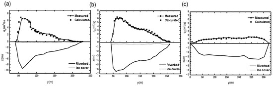 Section topography showing ice-cover and riverbed distribution, and the comparison of estimated and measured unit discharge: (a) Baotou section on 10 March 2015; (b) Baotou section on 18 February 2015; (c) Sanhuhekou section on 21 December 2013.