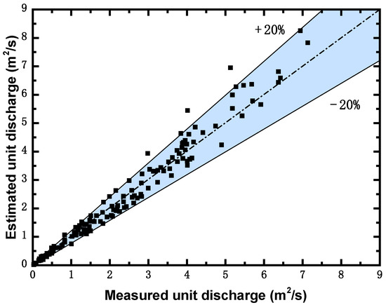 Similarly, the survey point was set at the thalweg of the section, and the cross-section characteristic coefficient was taken to be 0.5 and 0.25 for natural rivers and artificial channels respectively, to obtain the estimated unit discharge along the cross-section of the other sections (Figure 9, Figure 10 and Figure 12). The estimated and measured unit discharge is shown in Figure 15, where the abscissa represents the actual measured unit discharge; the ordinate represents the estimated unit discharge; and the scatter point represents that obtained by setting the survey point at the thalweg. The closer the scatter point to the middle 45° oblique line, the more accurate the estimation result—the shadow area indicates the error range within ±20%. In the given nine sections, the average error of unit discharge is 9.5%, and the error range is within 35.6%; 168 measurement points were selected in the nine sections, among which 90.5% of the estimated unit discharge deviates from the measured value within 20%.