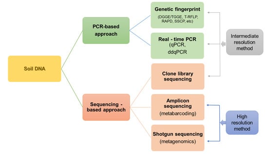 The use of molecular methods consisting of partial or complete determination of the community of soil microorganisms are powerful and universal tools for assessing the ecology of microorganisms living in their natural environment, thus enabling the connection of ecological processes in the environment with specific populations of microorganisms []. Most genetic studies are based on the sequence analysis of the 16S rRNA (prokaryotes) and 18S rRNA (eukaryotes) genes []. In addition, molecular methods for biodiversity analysis can be analyzed by type of nucleic acid extracted (DNA or RNA) or by using an analytical approach based on partial or total community analysis. Historical, but still applicable, approaches for the determination of soil microbial diversity have been based on partial (indirect) communities’ studies include, i.e., fingerprints method (e.g., electrophoresis in gradient denaturing gels DGGE, terminal restriction fragments length polymorphism—t-RFLP and single-strand conformation polymorphism—SSCP). Currently, sequencing techniques are more attractive methods for the analysis of environmental biology allowing for a complete analysis of the structure of microorganisms include metabarcoding and metagenomics, which represent high-throughput sequencing techniques such as next generation sequencing (NGS) and third generation sequencing (TGS) [,,].