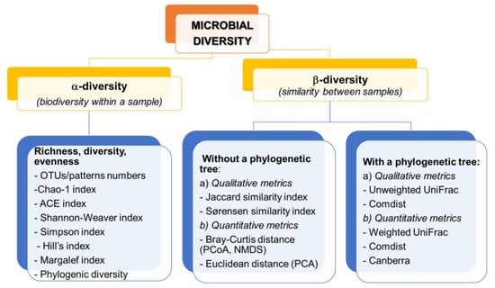 On the basis of the sequencing data, appropriate indicators are calculated, allowing the comparison of the structure of microorganisms both in a sample (α-diversity) and between samples (β-diversity) [,]. The division and examples of biodiversity indicators together with an example of visualization are presented in Figure 3.