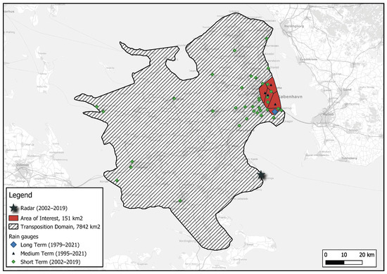 The Copenhagen area encompasses several meteorological measuring stations that are used to verify the results of the SST procedure. We utilize three different meteorological datasets in this study: rain gauges, Section 2.2; a regional rainfall model (derived from a national network of rain gauges), Section 2.3; and a single weather radar, Section 2.4.