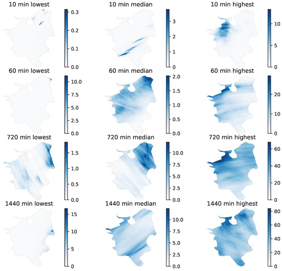 Examples of the spatial variability of accumulated rainfall depths for the duration-specific storms added to the final rainfall catalogs. The unit for the colorbars are in mm rainfall depth. Lowest, median, and highest refer to the rank of the domain mean rainfall depth.