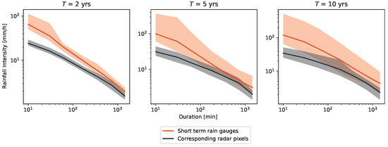Frequency analysis of rainfall data is an invaluable tool in the field of hydrology. An intuitive understanding of the relations between rainfall intensity, storm duration, and return levels is beneficial to modelers and decision makers in performing risk assessments and to design complex hydraulic and hydrological structures/systems. These relations can be described as intensity–duration–frequencies (IDF), also sometimes referred to as depth–duration–frequencies, and are derived statistically from rainfall measurements, most commonly from different types of rain gauge networks [1,2]. These networks can capture regional variability in rainfall but are rarely so densely located that the derived statistics can account for the heterogeneity and chaotic nature of rainfall fields [3]. This lack of spatial information is considered a great source of error in hydrological modeling [3,4,5,6,7], where non-homogeneous land covers can result in vastly different runoff times and general complex runoff response. A fast runoff response especially challenges hydrological modeling of urban areas, and is, thus, critical to short (sub-hourly) rainfall durations with high intensity, complex flow structures, and requirements to avoid capacity exceedances for low return levels. Urban hydrological models, therefore, require rainfall input data in high spatial and temporal resolution to discretize the runoff processes sufficiently.