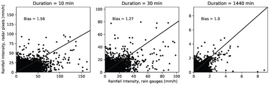 The fact that the radar data is bias-adjusted against rain gauges at daily time scale [30] might also influence the underestimation of short-duration intensities. This is discussed further in Section 4.3, where duration-specific biases are presented.