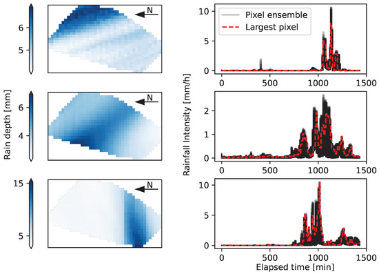 Figure 9 highlights one of the advantages of the SST framework: the ability to identify specific catchment-area rainfall events and classify their return levels, allowing for a much more detailed analysis of hydrological infrastructure. For complex surface areas such as urban environments, the presented storms (Figure 9) will most likely result in vastly different response signals. The relation between stochastically transposed areal input and system response is an objective to further investigate in another study.