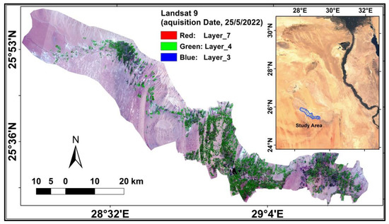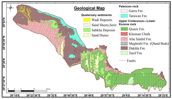 Geologically, the area under investigation comprises three geological features, including the Upper Cretaceous–Lower Eocene rock units in the area extending between Teneida and Abu Minqar, which is divided into Taref, Quseir Formations of the Nubian Sandstone Group, Duwi, Dakhla, Abu Simbil, Khoman, and Maghrebi formations. The Paleocene rock unit (Tarwan and Garraformations) constitutes the western portion of the depression in the research region, and it is composed of layers of coral limestone with calcite overlaps. Finally, the Quaternary sediments (Pleistocene sediments) are associated with Aeolian, marine, fluvial, and wadies sediments (scale 1:250,000) [56] (Figure 2).