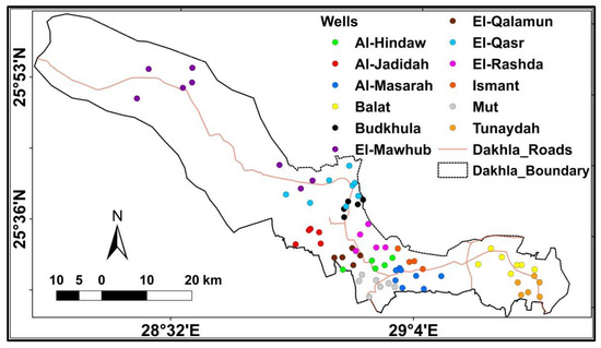 El-Dakhla Oasis represents a wide area of Egypt’s Western Desert in the New Valley Governorate, which lies between latitudes 25°25′45″ and 25°45′35″ N and longitudes 28°45′40″ and 29°25′45″ E. The studied area extends from Teneida village in the east to El-Mawhoub village in the west, approximately 65 km (Figure 1).