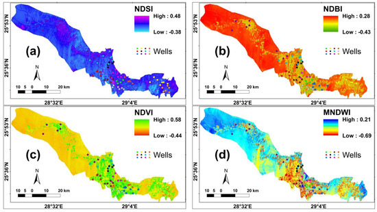 Spectral land use indices for the study area. (a); NDSI, (b); NDBI, (c); NDVI, (d); MNDWI.