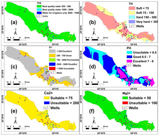 Spatial variation in the appropriateness of groundwater characteristics for consumption according to WHO [58] and Egyptian thresholds [59] are shown in Figure 6 and Table 3. Based on the measured pH values of the groundwater samples and the World Health Organization’s guidelines, the bulk of samples fell within the acceptable drinking limit. TDS levels in groundwater samples ranged from 101 to 520 parts per million. TDS levels of less than 1000 ppm were found in 98.6% of groundwater samples, indicating that it is safe to drink, whereas TDS levels of more than 1000 ppm were found in 1.4% of groundwater samples, indicating that it is unsafe to drink. According to the ECW, 500 ppm is the highest allowable level of TH in consumable water. A total of 59.5 % of the samples of groundwater were below the recommended limit, making them safe for consumption.