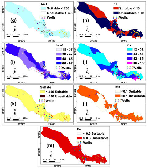 Spatial diversity in the appropriateness of groundwater characteristics for consumption according to WHO and Egyptian thresholds. (a); TDS, (b); TH, (c); EC, (d); pH, (e); Ca2+, (f); Mg2+, (g); Na+, (h); K+, (i); HCO3−, (j); Cl−, (k); SO42−, (l); Mn2+, and (m); Fe2+.