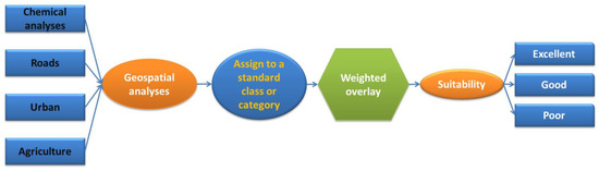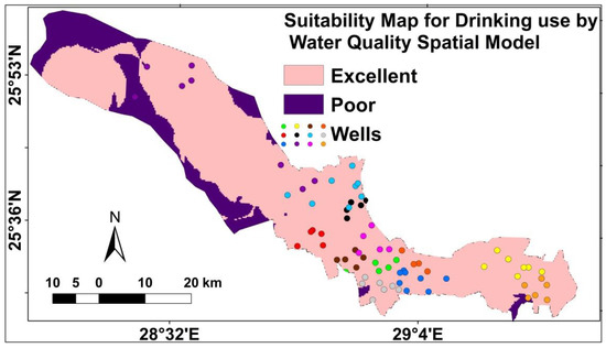To produce the map of groundwater compatibility for drinking in the studied region, we created a water quality spatial model (WQSM) (Figure 7). Each parameter is given a weight depending on its relative value for drinking purposes order, as shown in Table 4. Ca2+, Mg2+, Na+, and K+ are given a weight of 5; HCO3−, Cl− and SO42− are given a weight of 4; Mn2+ and Fe2+ are given a weight of 3; TDS, EC, pH, and TH are given a weight of 2; and land use parameters are given 1. The model scale is divided into two categories: excellent and poor (Figure 8). Inspection of the groundwater quality map for drinking uses (Figure 8) indicated that in most of the oasis, the underground aquifer is of superior purity. At the same time, groundwater with reduced quality is focused in the northwestern part of El-Dakhla Oasis, where the water must be treated to be suitable for drinking.
