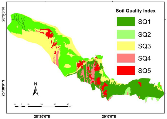 According to the soil quality grades (Figure 9), the soil quality was divided into five groups. The predominant grade (representing 70% of the region) was high quality (Q1 and Q2). Soil quality grades have a strong association with water quality ratings (r = 0.96). This showed that any of the soil and water parameters may be used to gauge the study area’s irrigation water and soil quality. These results on soil quality are in line with other studies [101,102]. Overall, all of the indicators for irrigation water quality had essentially identical patterns of soil quality spatial distribution, which is in line with the results of the studies [16,103]. Additionally, this demonstrated that soil type (sand fraction) has an impact on both good soil quality, which is found in the southeastern part, and most of the center of the study area, as well as poor soil quality, which is found in the northwestern part and some parts of the center. Additionally, due to being categorized as low or very low quality, the remaining 30% had high to severe limits, needing proper management techniques.