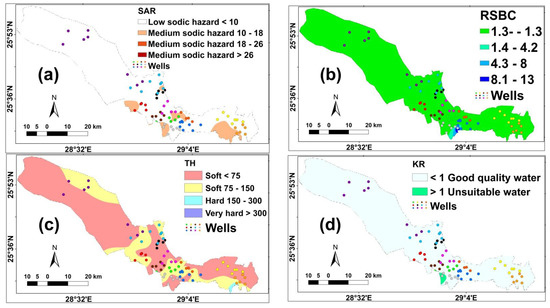 The proportion and quantity of groundwater wells appropriate for farming use, depending on the aforementioned factors, are shown in Table 5. All groundwater wells in the study area (100%) have TDS of less than 2000 mg L−1, making them appropriate for irrigation for all types of soil and crops. Measured SAR and RSC values make them suitable for irrigation as well. TH, KR, MH, pH, and Na% values showed that approximately 59.5%, 98.6%, 46%, 44.6%, and 43.2%, respectively, of the study area, are suitable, and 40.5%, 1.4%, 54%, 17.6%, and 56.8%, respectively, are unsuitable for irrigation and cause harmful effects on different soil types and toxic to some types of crops. Figure 10 depicts the regional distribution of their irrigated agriculture suitability inside the El-Dakhla Oasis.