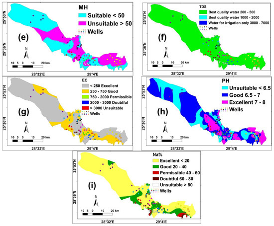 Spatial distribution of groundwater suitability for irrigation. (a); SAR, (b); RSC, (c); TH, (d); KR, (e); MH, (f); TDS, (g); EC, (h); pH, and (i); Na%.