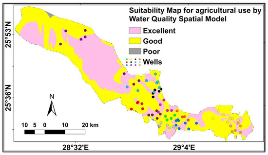 Ten water quality specifications for watering (pH, EC, TDS, SAR, Na%, RSC, KR, MH, TH, and land use parameters) were utilized to evaluate and map the farming appropriateness of groundwater by a water quality spatial model (WQSM) (Figure 11). Each parameter is assigned a weight in light of its relative relevance for farming (Na% is given a weight of 5, KR and MH are given a weight of 4, RSC and SAR are given a weight of 3, pH, TDS, EC, and TH are given a weight of 2, and land use parameters are given a weight of 1 (Table 6). The last irrigation-suitable groundwater map for the research region (Figure 12) shows that it is divided into three categories: excellent and good for irrigation of all types of crops and soils in most areas of the oasis, and poor for irrigation in very small areas in the north part of the oasis and it can be used to irrigate certain types of crops.