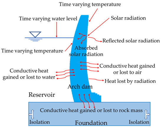 In China, a number of super-high arch dams have been built, such as the Ertan Arch Dam, Xiaowan Hydropower Project with Ultra-high Arch Dam and Jinping Level I Super High Concrete Arch Dam. All of them have been in service for many years with detailed and reliable monitoring data obtained. From the research and analysis, the working performance of super-high arch dams at the initial stage of impoundment and operation is quite different from that under the design condition [1,2]. The reason is that in the current code [3,4], the influence of nonlinear temperature differences in the dam section is not considered in the temperature load during operation, and the predicted reservoir water temperature is quite different from the measured value. Under such circumstances, Zhu [5] put forward a method to calculate the temperature load according to the actual upstream water level; Li et al. [6] used the analytical method and finite element method to calculate the temperature load of an arch dam, respectively, and considered that the results obtained by finite element method are consistent with the reality; Fu et al. [7] based on the simulation results of the whole process temperature field of the Xiaowan Arch Dam, established a simplified formula for temperature load by using the arch-beam load-distributed method.