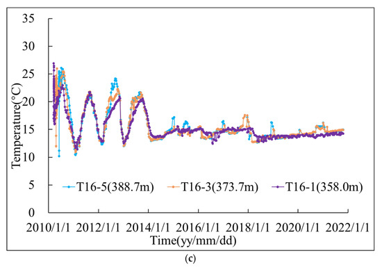 As shown in Figure 3a–c, the monitoring values of the thermometers near the upstream surface of the cantilever No. 16 dam section were selected to analyze the temperature of the upstream surface. It indicated that the surface temperature of the dam above the elevation of 400 m changes periodically with time. The measuring points at the elevation of 400–500 m are affected by the water temperature. From March to July, the temperature is the lowest and most stable at about 14 °C. In September, the temperature is the highest, with a temperature of 22 °C and an amplitude of 8 °C. Above 500 m elevations, the temperature of the measuring points is the lowest in March, with a temperature of 13.5 °C, and the highest in August, with a temperature of 25 °C and a temperature range of 11.5 °C. Below the elevation of 400 m, the surface temperature of the dam begins to stabilize in February 2014, and the stable temperature was about 14 °C.