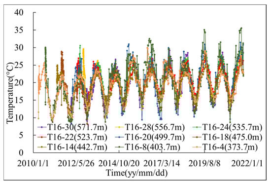 As shown in Figure 4, the monitoring values of the thermometers near the downstream surface of the cantilever No. 16 dam section were selected to analyze the temperature of the downstream surface. It indicated that the downstream surface temperature of the dam is mainly affected by the air temperature, which changed periodically with time, with the lowest temperature of 10 °C in January and the highest temperature of 30 °C in August. The variation law of the downstream surface temperature along the elevation direction is consistent.