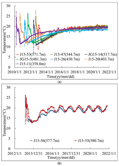 Temperature change process line of measuring points at transverse joints in No.15 dam section. (a) Measuring points below 571.7 m elevation; (b) Measuring points above 571.7 m elevation.