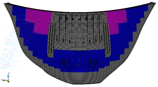 Considering the real structure and material zoning of the dam, the finite element mesh model of the arch dam foundation during the impoundment period was constructed. The model has a total of 245,614 units and 320,508 nodes, including the foundation, dam body (orifice, gate pier, hinged bearing beam, bracket, block angle, etc.), transverse joints and construction wide joints. In terms of the coordinate system, the X direction is set as the direction perpendicular to the river direction, pointing to the left bank; the Y direction is the direction along the river direction, pointing upstream; the Z direction is the vertical direction, pointing upwards. The overall finite element model of the dam body foundation is shown in Figure 6, and the finite element grid of the dam body is shown in Figure 7.