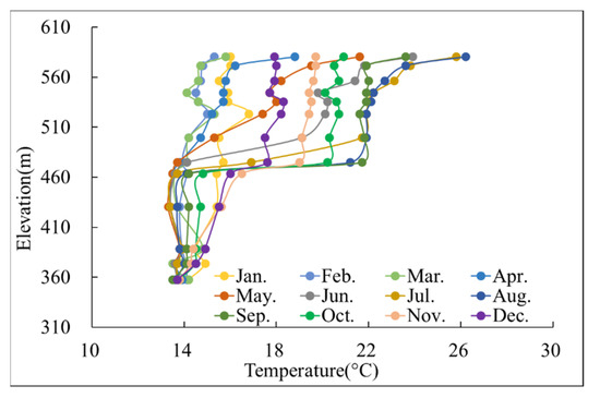 The boundary conditions of design water temperature were calculated by the method of the specification [3], as shown in Figure 13. Compared with the measured reservoir water temperature, it can be found that the reservoir water temperature is basically stable below the elevation of 475 m. According to the specification, the designed reservoir bottom water temperature is 12 °C, while the measured reservoir bottom water temperature is 14 °C. The former is lower than the latter. The deep-hole flood discharging was not taken into consideration in calculating the design reservoir water temperature, so the design water temperature is quite different from the measured one above the elevation of 475 m. It can be seen that the boundary of the designed reservoir water temperature is different from that of the actual reservoir water temperature.