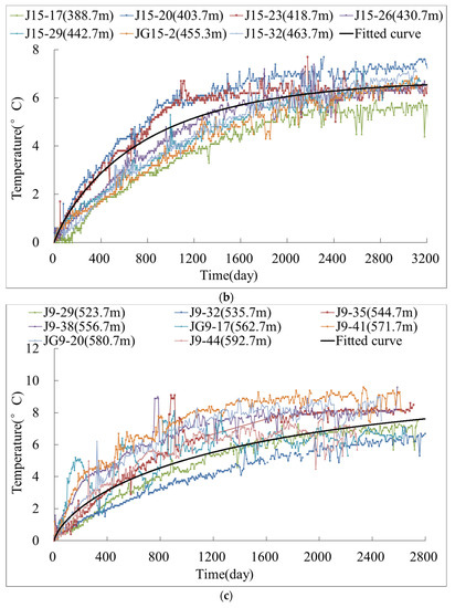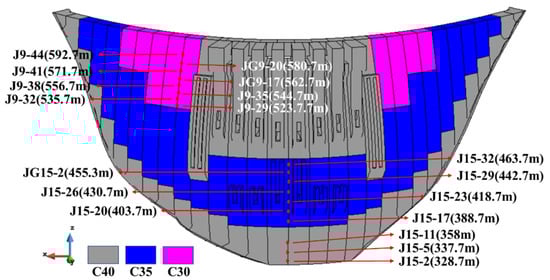 In order to fully consider the change in concrete temperature recovery in the later stage after the transverse joint grouting and water pipe cooling, the joint meter temperature monitoring results of the No. 9 and No. 15 transverse joints were collated and counted according to the dam concrete zoning, and the monitoring values of concrete temperature rise at the end of second-stage cooling monitored were obtained. After that, the later temperature recovery models of C40, C35 and C30 concrete were analyzed and fed back. Figure 9 shows the location of the joint meters, Figure 10 shows the concrete temperature rise process line. The combinatorial double exponential equation is used to represent the temperature rise in concrete in this paper. The temperature rise models of three kinds of concrete at the later hydration stage were obtained by inversion as follows: