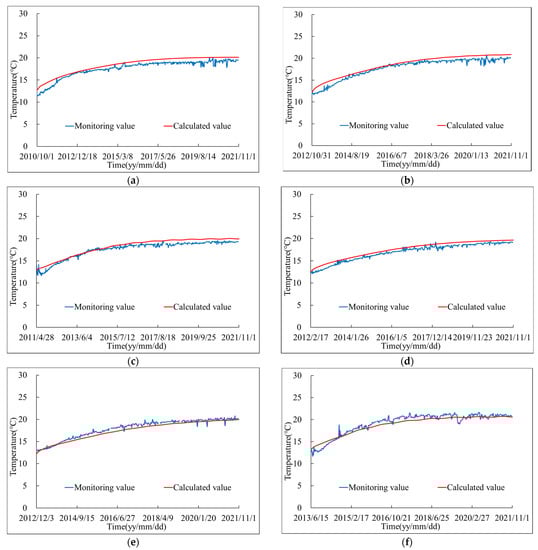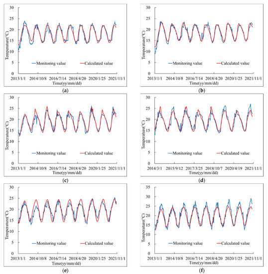 Based on the above calculation model, temperature boundary conditions, thermal parameters and the temperature recovery model of concrete in the later stage obtained by inversion, the temperature field of the arch dam at the initial stage of impoundment was obtained by finite element simulation analysis. Figure 11 shows the comparison between the monitored and calculated values of temperature at the dam surface measuring points, in which (a–d) are the measuring points at the upstream surface, and (e,f) are those at the downstream surface; Figure 12 shows the comparison between the monitored and calculated values of temperature at the measuring points inside the dam. It can be seen that the variation law of simulation temperature at the measuring point is consistent with that of the measured temperature, and two values are in good agreement, which indicates that the finite element simulation analysis method and thermal parameters adopted are reasonable.